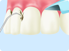 磨き残しによる汚れ(プラーク)は、時間が経つと石灰化して歯石になり、歯に固着します。これらを取り除くことは、むし歯や歯周病の予防・治療の基本です。汚れは歯磨きで落とせますが、歯石は除去できません。歯石取り(スケーリング)では、金属や超音波のスケーラーなどの専用器具を使い、歯の周囲に付着した歯石を丁寧に除去します。